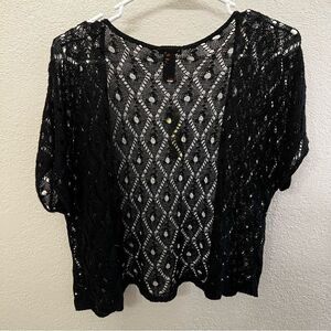 This open crop wrap is from Copper Key. The item is NWT. The item is short sleeve. It is black with a lace like structure. The wrap is made out of 100% acrylic. The size is small. The measurements are 16” L x 23” W (pit to pit) x 9” sleeve (collar to cuff). This fun wrap is new with tags.