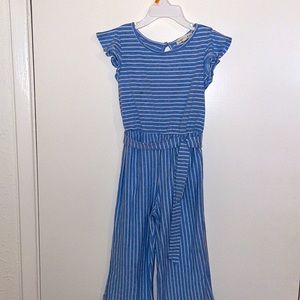 Super cute romper short pants. Copper Key is the brand. Color is blue/white stripes. Has a tie waist detail. Girls size 5 with ruffled sleeves. Awesome condition.