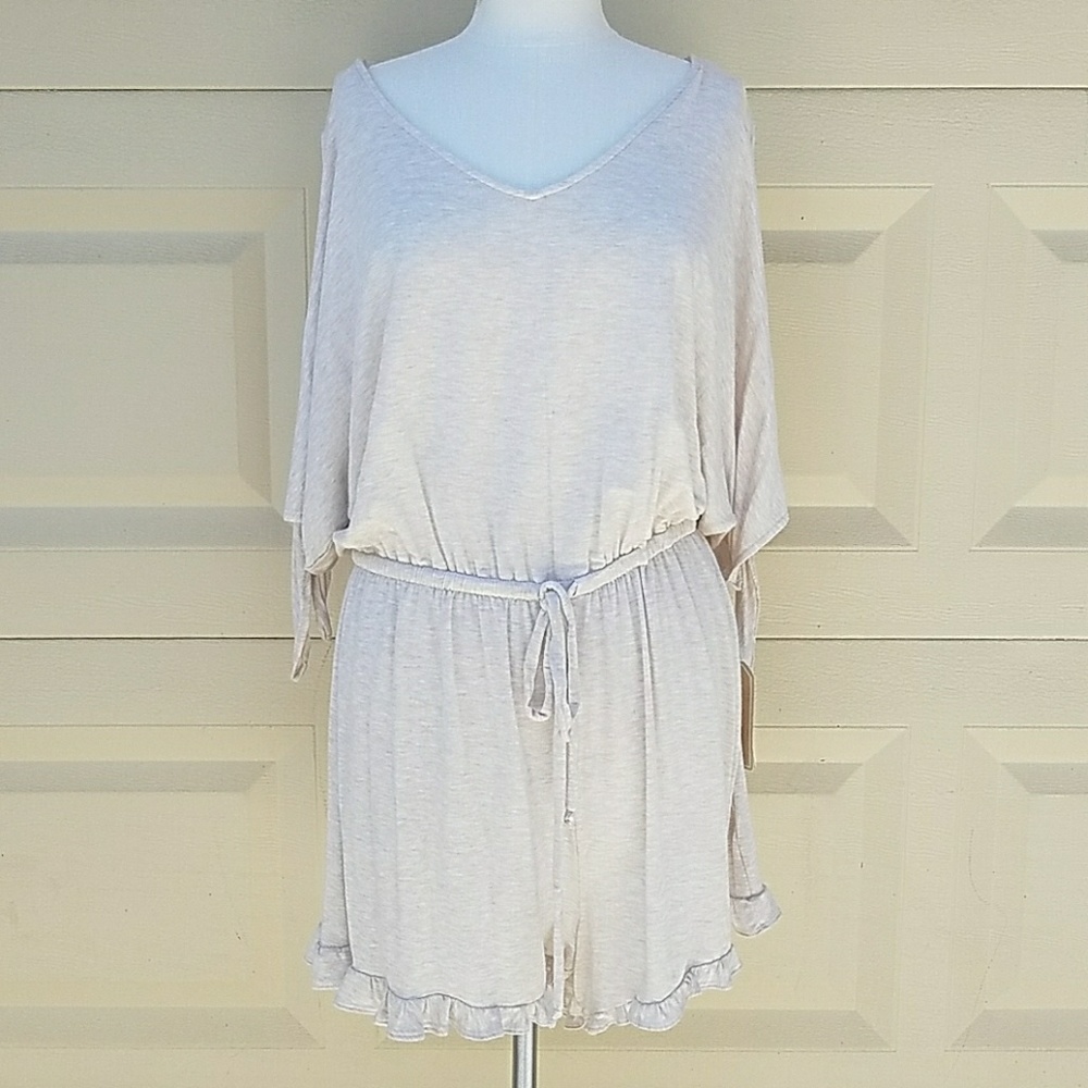 This is a Copper Key Dolman Sleeve Ruffle Romper in cream. It features a V-neck, an adjustable drawstring waist, dolman sleeves with adjustable ties, and a ruffled hem on the bottom.