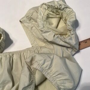 Puff sleeves. Cotton lining. Elastic waist and sleeve opening. Wear off the shoulder or on. Pullover top. Cotton blend material. Measurements pictured. Excellent used condition.