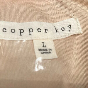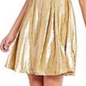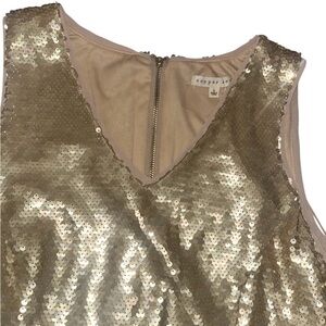 Copper Key gold sequined dress, size Large. This dress is fully lined and measures 22” from shoulder to hem. It flat lay measures 17” pit to pit and 14” at the waist. This makes a great party, cocktail party or even cruise dress.