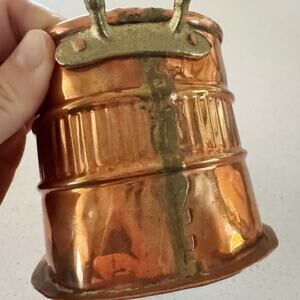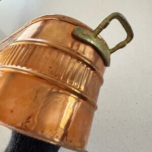 Solid copper small barrel about 7“ x 3 1/4“ x 4“ has two little handles would be cute with some plants in it