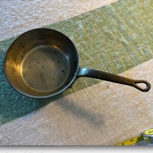 Vintage, super heavy, copper pot, lined with stainless steel. Stamped "Made in France". 9" wide on top & 7" wide on the bottom & 3.25" deep. Handle is very secure. No defects other than the patina. I have not tried to polish this pot.