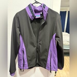 Comfortable purple and black softshell jacket with full front zipper. Lightweight, wind-resistant fabric with zippered pockets for secure storage. Stylish contrast panels and a stand collar for added warmth. Easy-care design perfect for everyday wear.