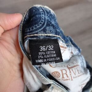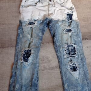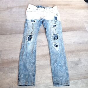 Copper Rivet Jeans Bandana Print Paint Dip Ripped Slim Fit Blue Pants 36/32