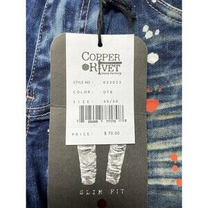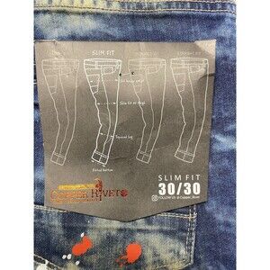 Copper Rivet Slim Fit Tapered Leg Men's Patched Distressed Paint Splash Jeans Size 30x30