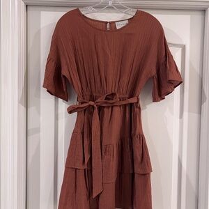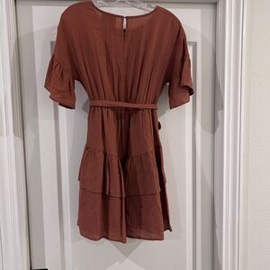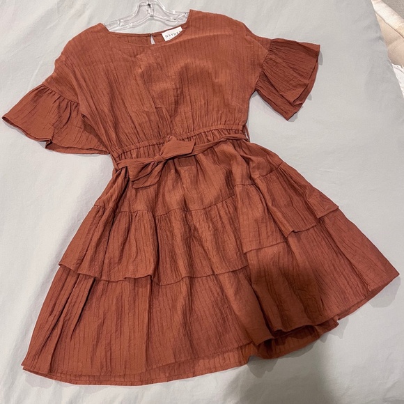 Beautiful copper-colored, ruffled, short dress — perfect for an evening out or cocktail.