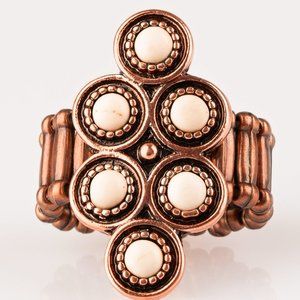 Dainty white stones are pressed into ornate copper frames, coalescing into an earthy frame atop the finger. Features a stretchy band for a flexible fit.