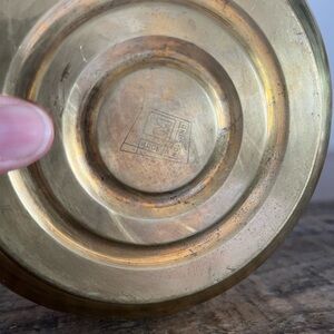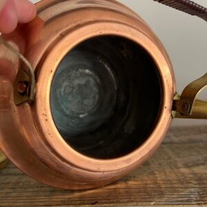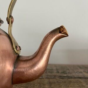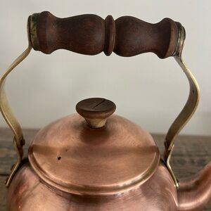 Brass and wood handle. Lid has wooden knob which is cracked and wiggly. See video. Otherwise in very nice vintage condition! Spout has a cork stopper!