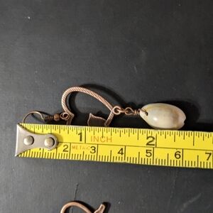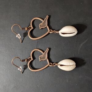 Copper Tone Heart and Bird with Cream Puka Shell Dangle Drop Statement Earrings. 2.75" long.