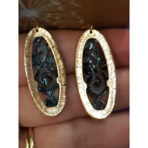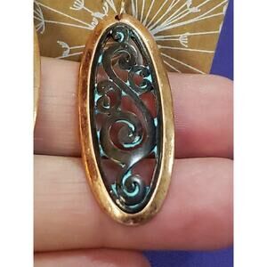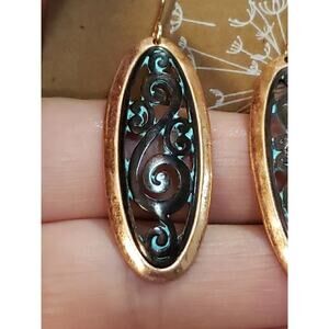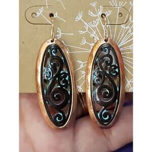 These are beautiful dangle earrings in a long oval shape. They have a copper ring around the edge and an antiqued bronze (very dark brown almost black) scrollwork center with a simulated green verdigris on the scrollwork. They drop approximately 1 5/8" on hooks and are just over half an inch wide. These are new on the original card.