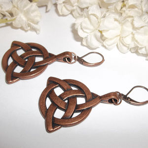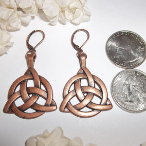These statement boho trinity knot earrings have an intricate rustic copper toned Celtic or Irish open weave design. Brand new and handmade by me - wvluckygirl. The pair dangle & drop from lever backs for her pierced ears. Measure 2 1/8 inches tall & 7/8 inch wide. Each single earring weighs approximately 5.6 grams. Nice and heavy weighted pair. This particular knot design is meant to symbolize the power of three. In some places it means air, wind, and fire. In others it represents birth, life, and death.