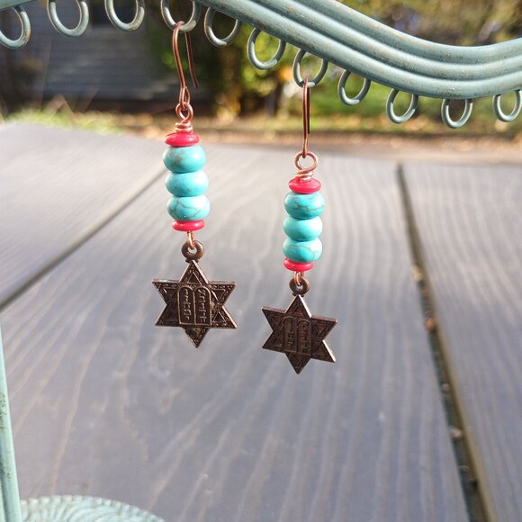 Vintage copper star of David pendants ca 1950s, turquoise color howlite rondelle beads with red coral accent beads, copper ear wires.