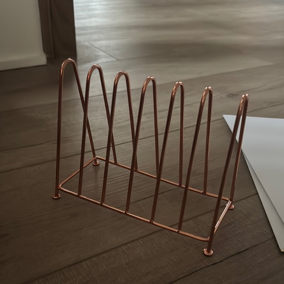 Stylish copper wire magazine rack. Perfect for organizing magazines or files.