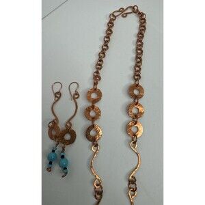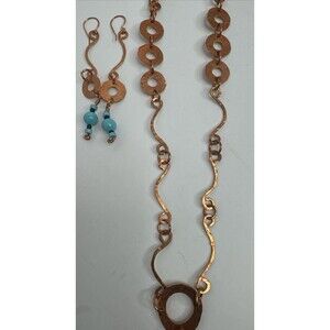 Handmade by me Southern Sista, bare copper hammered necklace, and earring set with Turquoise Gemstones and Black Glass Beads. Necklace is approximately 22" long and earrings approximately 3.5" long.