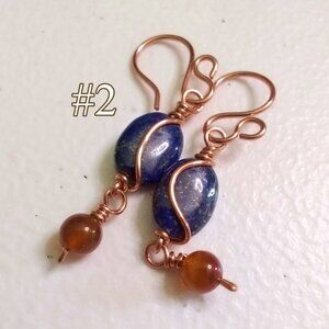 Celebrate the golden hush of autumn with these handcrafted copper wire wrapped earrings, featuring the deep midnight blue of Lapis Lazuli and the earthy warmth of russet Agate. This pair evokes the turning leaves and twilight skies of fall - where mystery meets grounded elegance. Hand shaped & hammered natural copper earwires.
