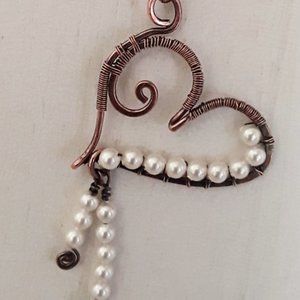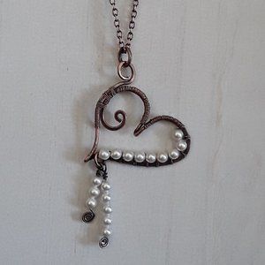 Oxidized copper, wire-wrapped, heart necklace with delicate pearls. It comes with an 18 inch oxidized copper chain. The hook and clasp are also handmade, hammered, solid oxidized copper.