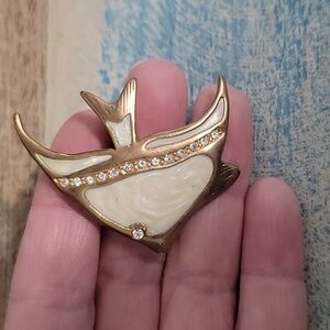 Elegant fish-shaped brooch in copper and cream Enamel. Features sparkling rhinestones for added shine. There are no markings I can find
