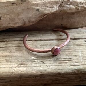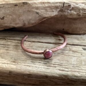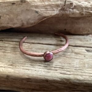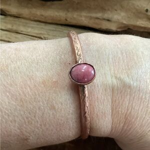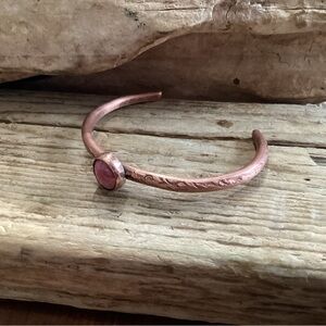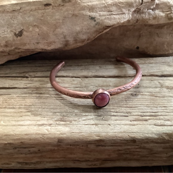 I designed and hand crafted this genuine copper and rhodonite copper cuff bracelet. It is hand stamped with a unique vinelike design. the underside of the cuff is stamped with my maker's mark. This bracelet is slightly oxidized and then buffed out and sealed with a jeweler's wax. It measures 5 3/4 inches long. from side to side it is 2.5 inches. The opening is 1.5 inches.