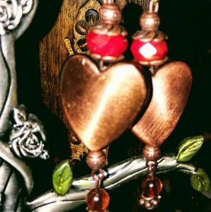 Dangle earrings with copper hearts and stone is an aurora borealis Czech bead that glimmers all different colors .red, pink ,peaches and gold .followed by copper spacer and a amber glass bead.