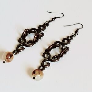 These fun earrings are 3 inches long, made with copper color light-weight alloy metal & 10mm glass beads.