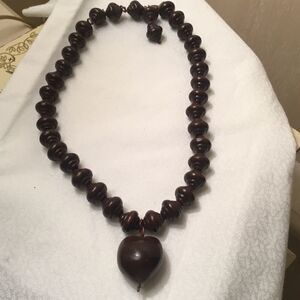Shiny dark brown wooden beads with copper tone lobster claw clasp. It measures 16” in length before the little pendant nut drop of 2 1/2”. Same on both sides. $8 each or bundle 3 of same price for $15 and save.