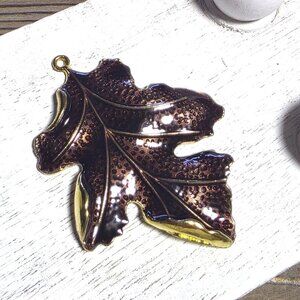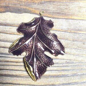 Coppery Brown Enamel on Gold Tone Alloy 3D Textured Large Autumn Leaf Pendant