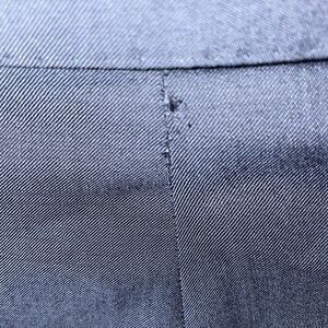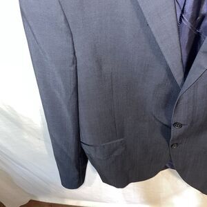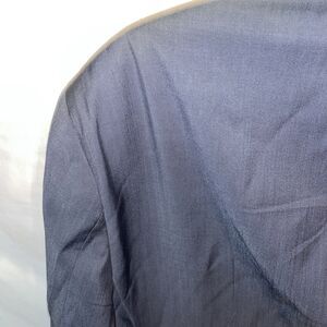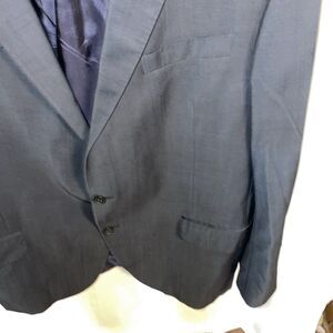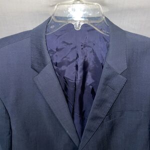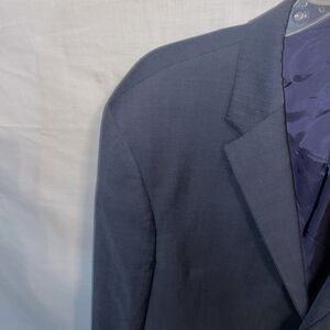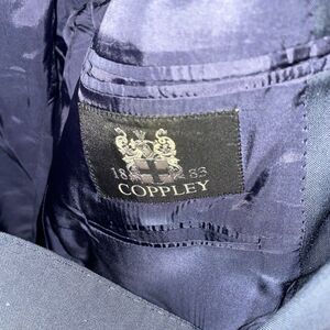 This mens navy blue wool Coppley dress blazer has one imperfection on upper back neck. Still looks great!