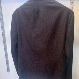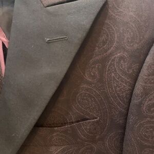 Elevate your wardrobe with this stunning Coppley blazer, crafted from luxurious Tessilstrona Italian fabric (Biella, Italy). The deep black base features a refined paisley jacquard pattern with a subtle purple undertone, making it a standout piece for formal events, dinners, or nights out.