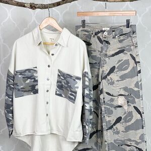 The perfect shacket for the transition weather! Featuring a button front and camo sleeves.