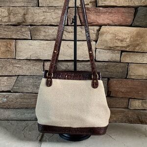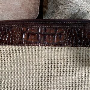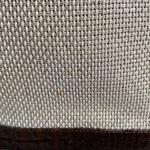 Beautiful Brahmin leather and woven purse. Leather is in great condition. There are a few spots on the woven part of the purse. See pics. They are small but they are there. I have not tried to get the spots out. The inside is almost a suede feel. Material is in good condition other than some spots. No rips. Normal inside wear for the age of the purse. Great summer purse.