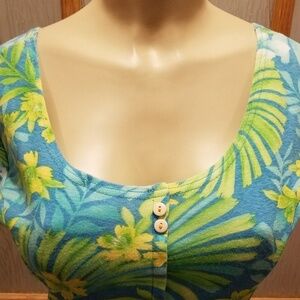 Features a bright splashy floral design on a comfy-soft cotton-poly blend. Feels like your favorite T-shirt! In beautiful condition.