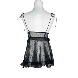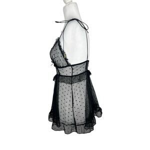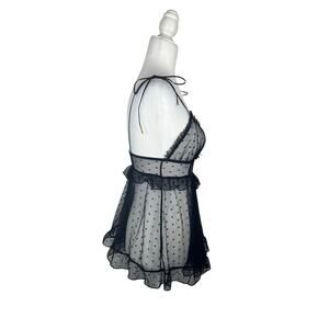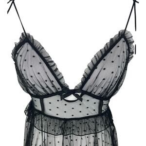 Coquette Black Polkadots Frilled Sheer Babydoll Chemise With Ribbon Detail and tie straps.