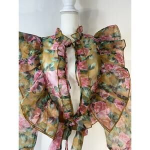 Coquette, Holiday Whimsigoth Fairy Feminine Joy & Ash Sheer Floral Top in Sz M is a stylish addition to any woman's wardrobe. The long balloon sleeves and ruffle accents add a touch of flair to the cropped blouse, which is made of breathable polyester material. The solid pink color and collared neckline give it a chic and romantic feel, perfect for all seasons. With its slimming and belted design, this top is both fashionable and comfortable, making it a versatile piece for any woman who loves a pop of color in her outfit.
