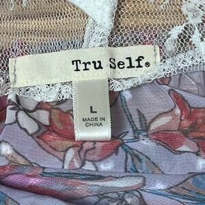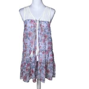 Tru Self size large floral cover up dress. This lightweight mini features a semi-sheer purple-lilac mesh body with pink and blue floral print, tiered ruffle skirt, and a white crochet mesh upper yoke with embroidered detail. Finished with a V-neckline, rope-style tassel tie front, and sleeveless silhouette, it’s perfect as a swim coverup or breezy vacation dress. Unlined and airy, it’s ideal for beach days, cruises, poolside lounging, or summer getaways. Feminine, flirty, and comfortable. Style# 1NGTEPLS. RN# 96741. Material: Body 100% Polyester, Yoke 83% Nylon, 17% Spandex. Comes from a smoke free home.