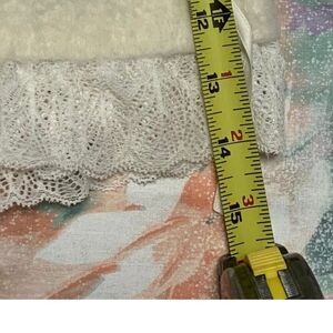 This adorable white mini skirt features a soft, textured fabric with charming lace and ribbon details on the front pockets. The hem is beautifully finished with delicate lace trim, adding a sweet and elegant touch. The skirt includes built-in shorts for added comfort and coverage, making it both cute and practical. It also features a discreet side zipper for easy wear. Perfect for a soft, feminine look!
