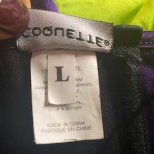 Bustier with floral printed lace over satin on front panels, padded underwire cups, boning, removable straps and garters, lace-up back, and side hook and eye closure.