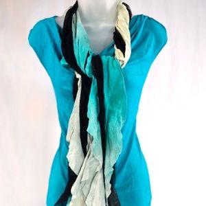 This hand-dyed jersey knit has a beautiful draped neckline, and pairs perfectly with the Renee Ruffle Scarf by Art of Cloth. Available in S, M. L, XL. Note this top is runs slightly large.