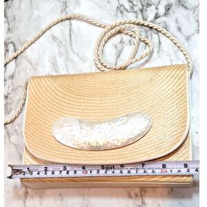 Gorgeous delicate woven bag in light straw with a decorative mother of pearl shell finish on the front flap.