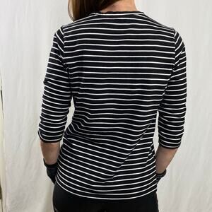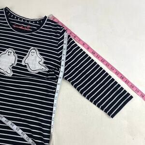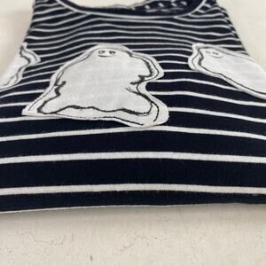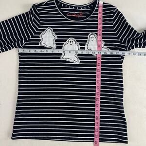 Coral Bay Black White Striped Ghosts Half Sleeve T-Shirt in good. O dot ion. Cotton poly blend. Loved and adored. Flaws include some fuzzies and a wee bit of natural fade.