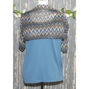 Elevate your style with this Coral Bay Blue & Brown Chevron Print Blouse Top in size large. It's sheer, lined, with 3/4 sleeves, perfect for career, office, or casual wear.