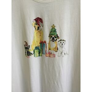 2. White tee with a group of dogs wearing different christmas accessories around the tree with presents