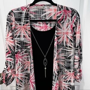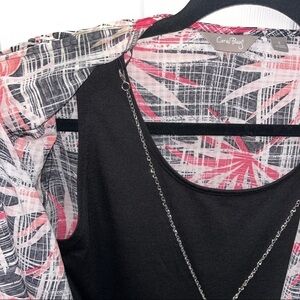 Faux layered design has faux tank top underneath look with attached necklace. Very cute design without the added layers!