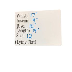 * Measurements: All measurements taken with garment lying flat. Waist 17", inseam 9", rise 10", length 19".
