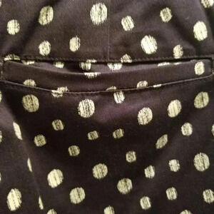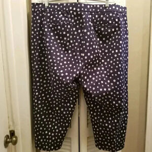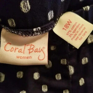 Coral Bay navy blue with white dots capri's size 18W. 2 front and 2 back pockets. Waist 21", rise 12.5", and inseam 20.5 ". 97% cotton and 3% spandex.
