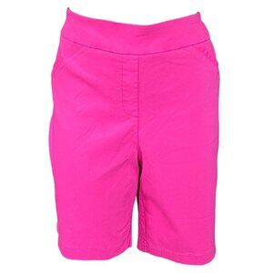 These Coral Bay Pink Rayon Blend Stretch Shorts in size 16 are perfect for a casual occasion. With a pull-on closure and mid-rise fit, they offer comfort and style. Made from a rayon nylon spandex blend fabric, these Bermuda shorts feature a flat front design, back pockets, and stretch material for ease of movement. Ideal for summer and spring, these shorts are easy to care for and machine washable. Perfect for a day out in the sun or a game of golf, these shorts are a versatile addition to any wardrobe.