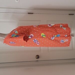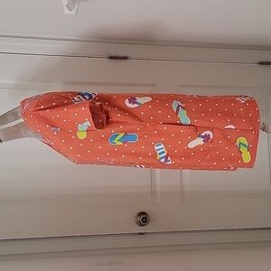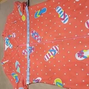Coral Bay Size S Terry Cloth Zipper Front Swimsuit Cover, Excellent Condition. Salmon Color with Multi Color Flip Flops and White Polkadots. Short Sleeve with Pockets. Please refer to measurements in photos to ensure proper fit.