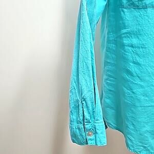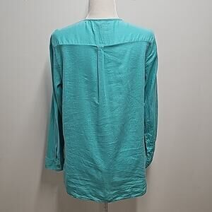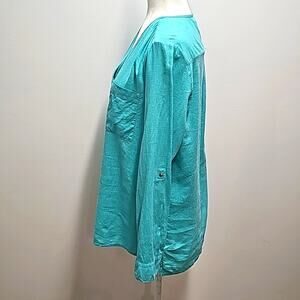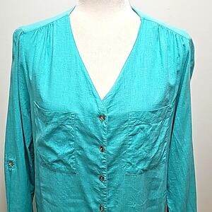 Coral Bay Turquoise Long Sleeve Linen Rayon Two Pocket V-Neck Top Blouse Sz M
