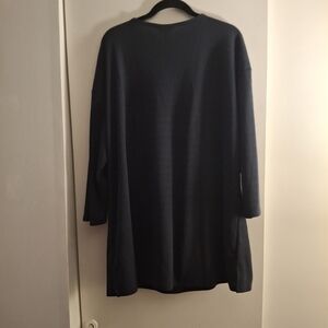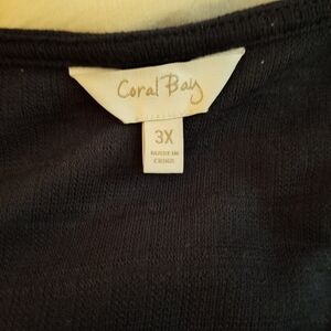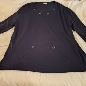 Elegant dark blue top by Coral Bay. Ideal for everyday comfort. Has metal grommets and front kangaroo pocket. Size 3X. pit to pit measures 27 inches. Length 30 inches.