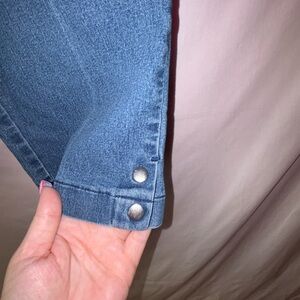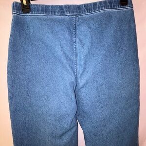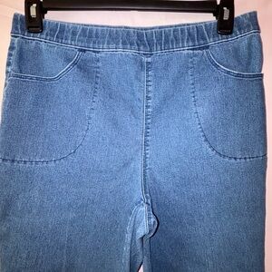 Great pair of capris! Elastic waistband, button embellishments at the leg hem for detail and deep front pockets.